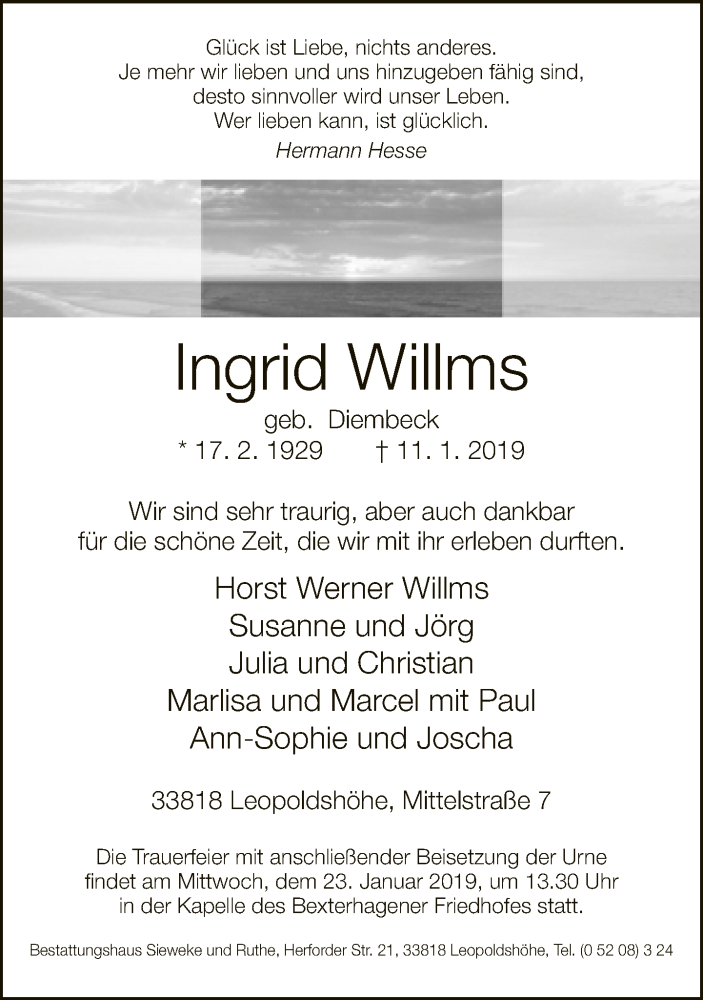 Hier finden Sie alle Traueranzeigen aus der Zeitung, die bisher für Ingrid Willms erschienen sind. Weitere Traueranzeigen, die in der Zeitung erscheinen, werden hier ebenfalls aufgelistet