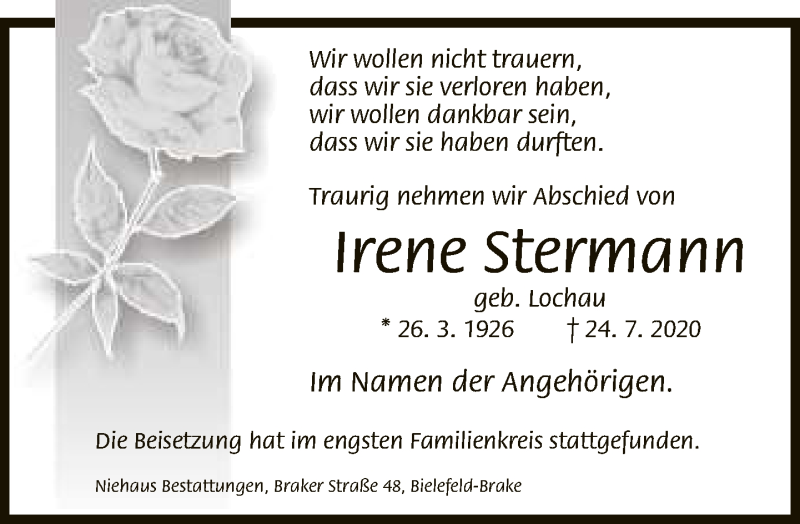 Hier finden Sie alle Traueranzeigen aus der Zeitung, die bisher für Irene Stermann erschienen sind. Weitere Traueranzeigen, die in der Zeitung erscheinen, werden hier ebenfalls aufgelistet