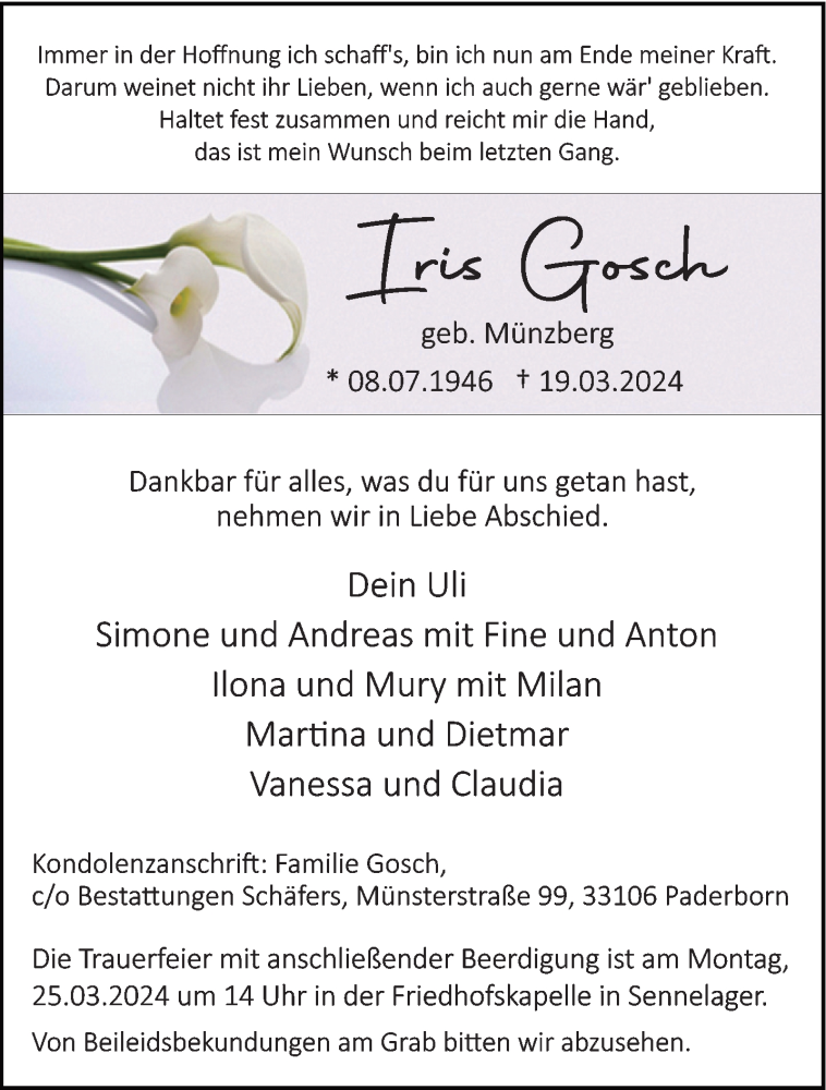 Hier finden Sie alle Traueranzeigen aus der Zeitung, die bisher für Iris Gosch erschienen sind. Weitere Traueranzeigen, die in der Zeitung erscheinen, werden hier ebenfalls aufgelistet