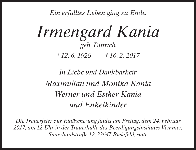 Hier finden Sie alle Traueranzeigen aus der Zeitung, die bisher für Irmengard Kania erschienen sind. Weitere Traueranzeigen, die in der Zeitung erscheinen, werden hier ebenfalls aufgelistet
