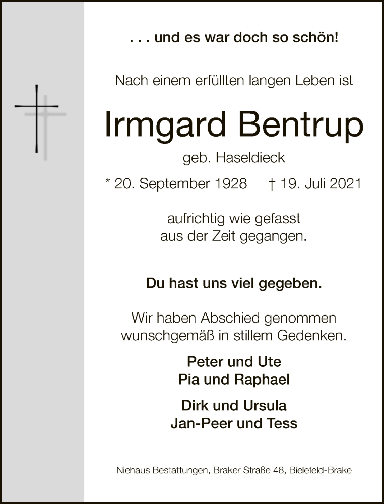 Hier finden Sie alle Traueranzeigen aus der Zeitung, die bisher für Irmgard Bentrup erschienen sind. Weitere Traueranzeigen, die in der Zeitung erscheinen, werden hier ebenfalls aufgelistet