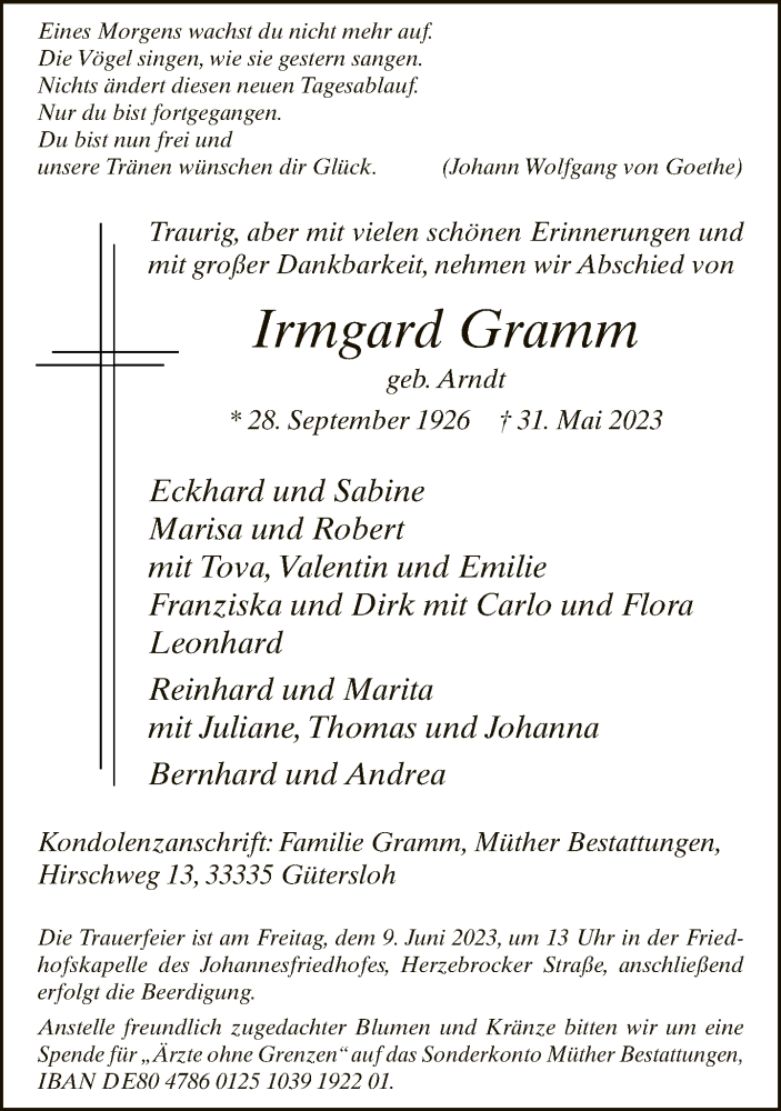Hier finden Sie alle Traueranzeigen aus der Zeitung, die bisher für Irmgard Gramm erschienen sind. Weitere Traueranzeigen, die in der Zeitung erscheinen, werden hier ebenfalls aufgelistet