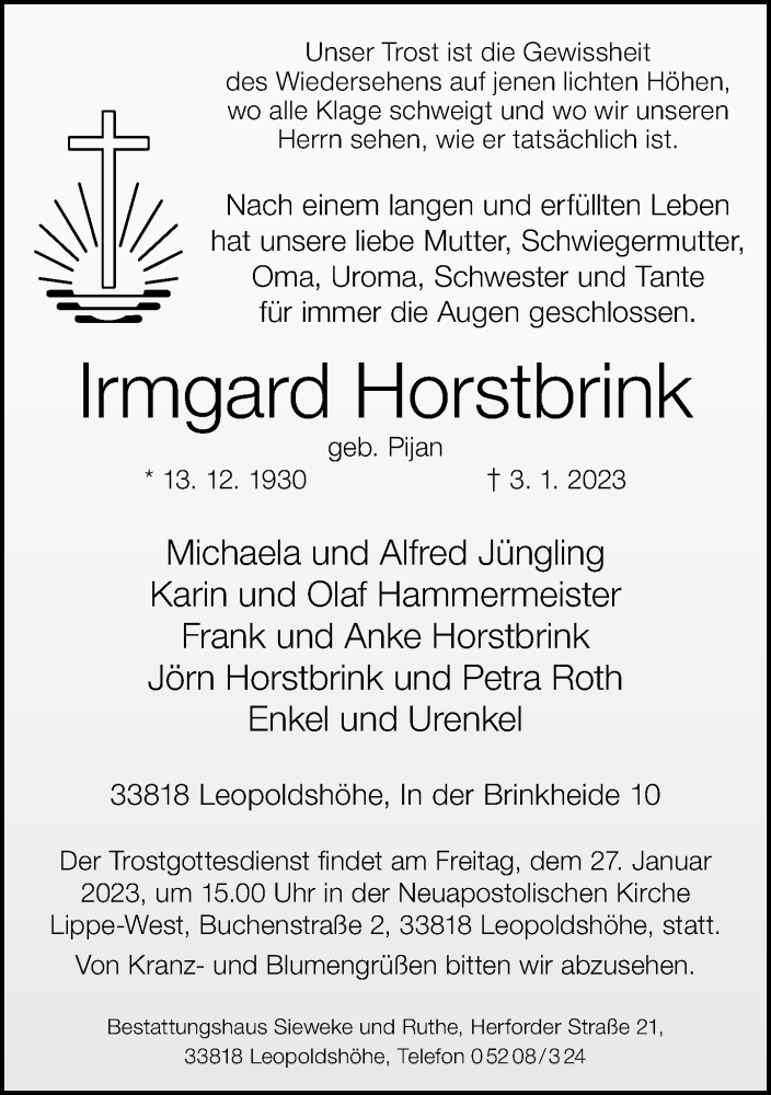 Hier finden Sie alle Traueranzeigen aus der Zeitung, die bisher für Irmgard Horstbrink erschienen sind. Weitere Traueranzeigen, die in der Zeitung erscheinen, werden hier ebenfalls aufgelistet