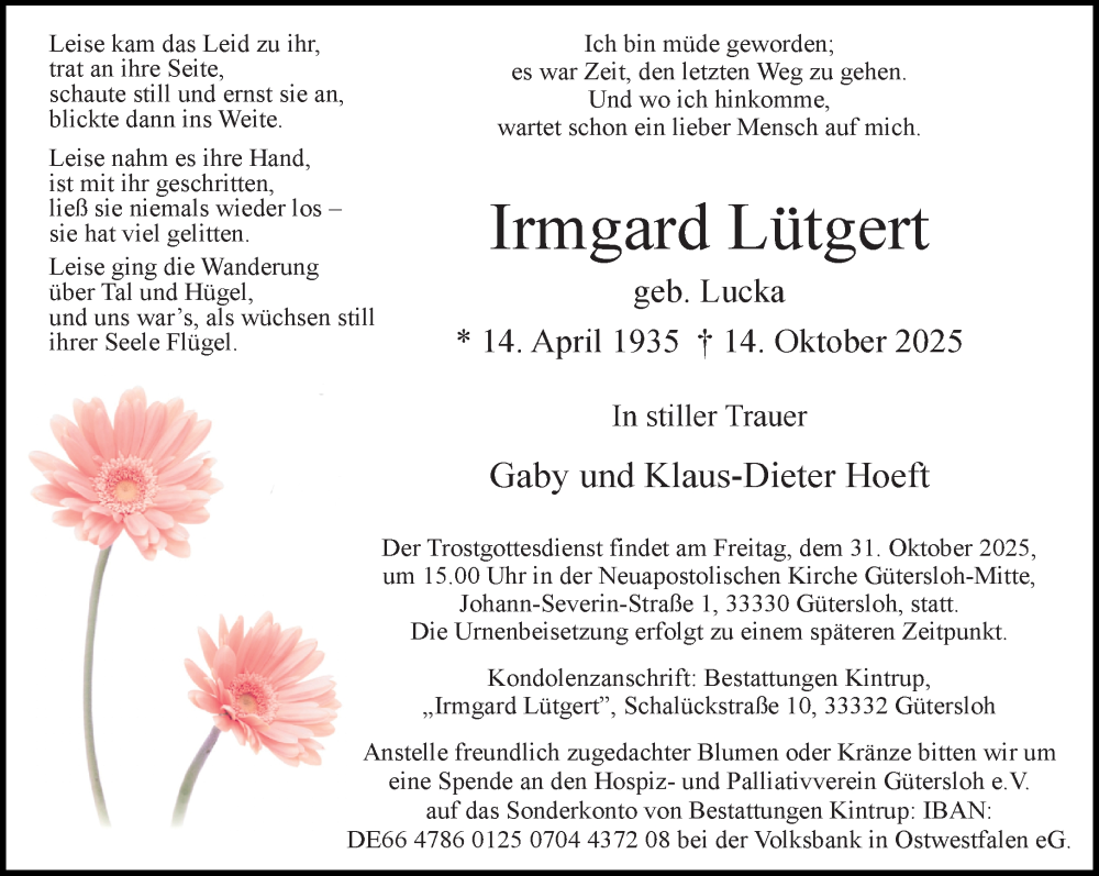 Hier finden Sie alle Traueranzeigen aus der Zeitung, die bisher für Irmgard Lütgert erschienen sind. Weitere Traueranzeigen, die in der Zeitung erscheinen, werden hier ebenfalls aufgelistet