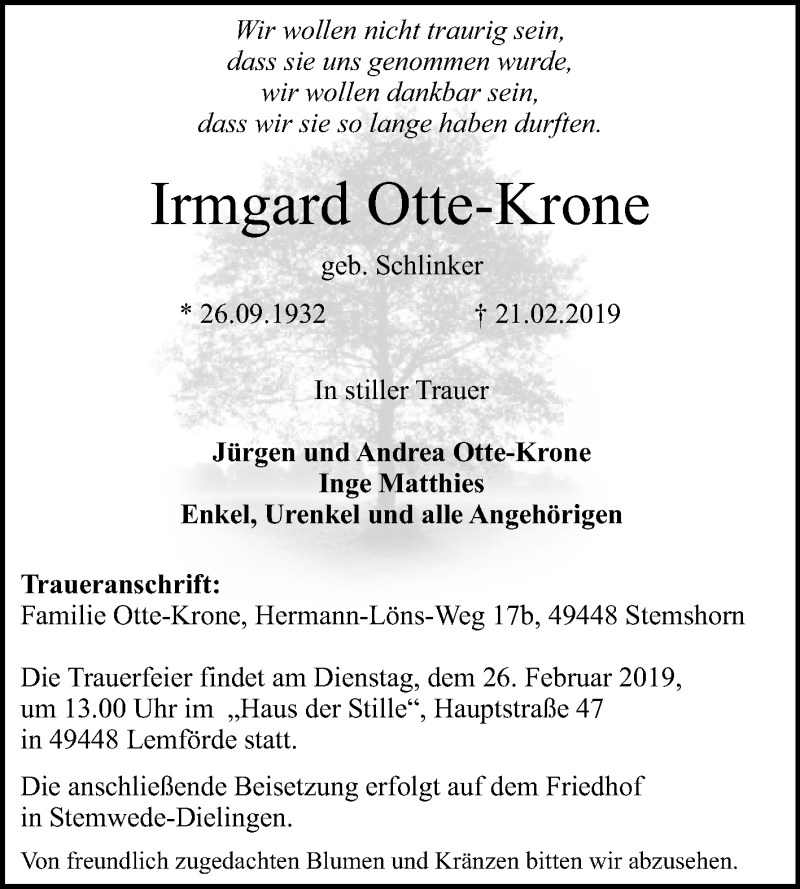 Hier finden Sie alle Traueranzeigen aus der Zeitung, die bisher für Irmgard Otte-Krone erschienen sind. Weitere Traueranzeigen, die in der Zeitung erscheinen, werden hier ebenfalls aufgelistet