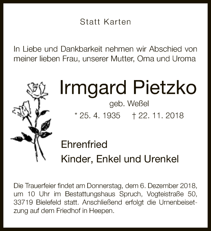 Hier finden Sie alle Traueranzeigen aus der Zeitung, die bisher für Irmgard Pietzko erschienen sind. Weitere Traueranzeigen, die in der Zeitung erscheinen, werden hier ebenfalls aufgelistet
