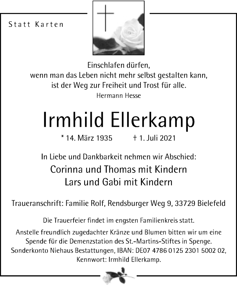Hier finden Sie alle Traueranzeigen aus der Zeitung, die bisher für Irmhild Ellerkamp erschienen sind. Weitere Traueranzeigen, die in der Zeitung erscheinen, werden hier ebenfalls aufgelistet