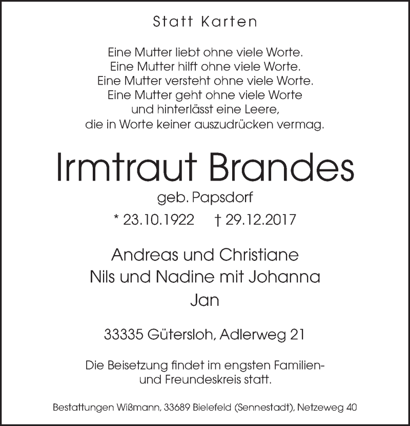 Hier finden Sie alle Traueranzeigen aus der Zeitung, die bisher für Irmtraut Brandes erschienen sind. Weitere Traueranzeigen, die in der Zeitung erscheinen, werden hier ebenfalls aufgelistet