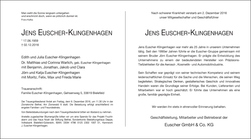 Hier finden Sie alle Traueranzeigen aus der Zeitung, die bisher für Jens Euscher-Klingenhagen erschienen sind. Weitere Traueranzeigen, die in der Zeitung erscheinen, werden hier ebenfalls aufgelistet