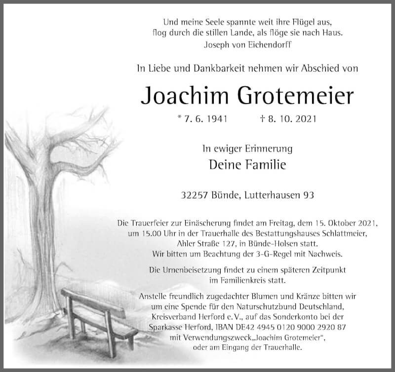 Hier finden Sie alle Traueranzeigen aus der Zeitung, die bisher für Joachim Grotemeier erschienen sind. Weitere Traueranzeigen, die in der Zeitung erscheinen, werden hier ebenfalls aufgelistet