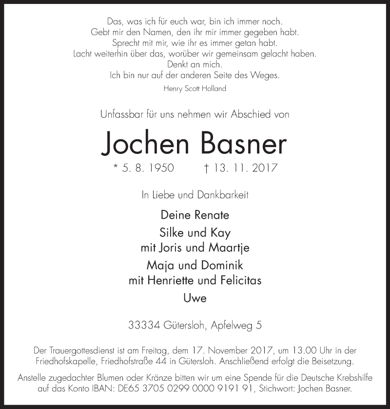 Hier finden Sie alle Traueranzeigen aus der Zeitung, die bisher für Jochen Basner erschienen sind. Weitere Traueranzeigen, die in der Zeitung erscheinen, werden hier ebenfalls aufgelistet
