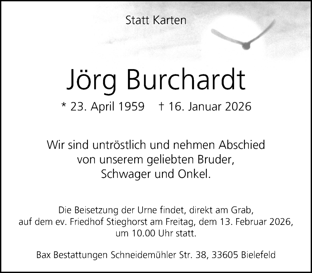 Hier finden Sie alle Traueranzeigen aus der Zeitung, die bisher für Jörg Burchardt erschienen sind. Weitere Traueranzeigen, die in der Zeitung erscheinen, werden hier ebenfalls aufgelistet