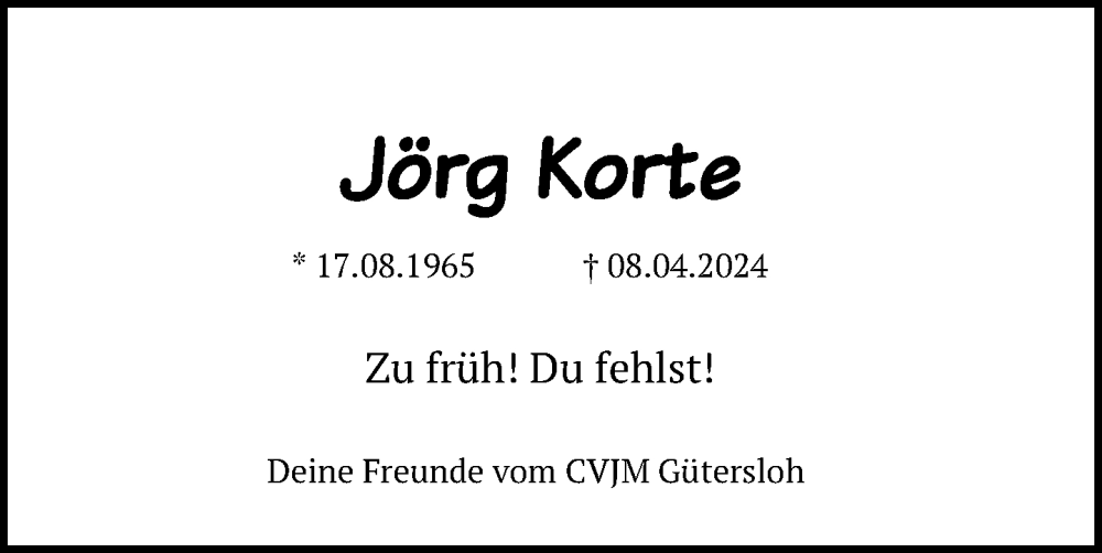 Hier finden Sie alle Traueranzeigen aus der Zeitung, die bisher für Jörg Korte erschienen sind. Weitere Traueranzeigen, die in der Zeitung erscheinen, werden hier ebenfalls aufgelistet