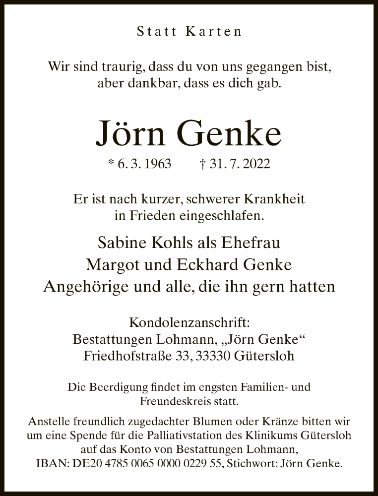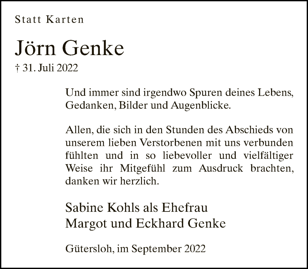 Hier finden Sie alle Traueranzeigen aus der Zeitung, die bisher für Jörn Genke erschienen sind. Weitere Traueranzeigen, die in der Zeitung erscheinen, werden hier ebenfalls aufgelistet