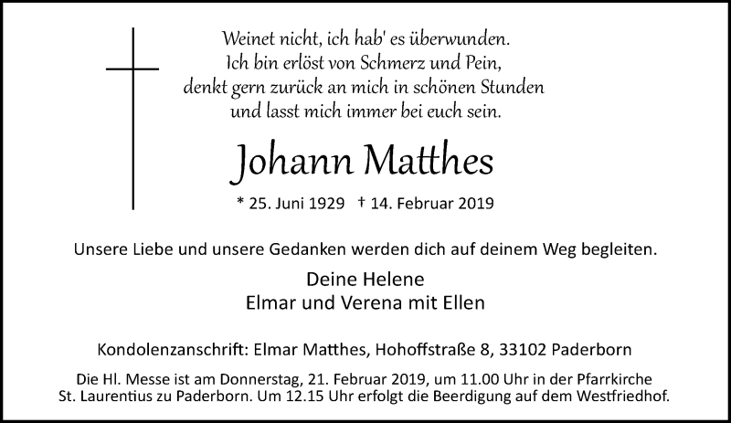Hier finden Sie alle Traueranzeigen aus der Zeitung, die bisher für Johann Matthes erschienen sind. Weitere Traueranzeigen, die in der Zeitung erscheinen, werden hier ebenfalls aufgelistet