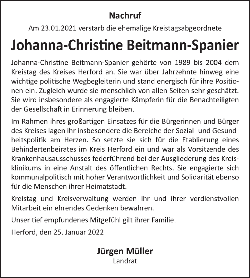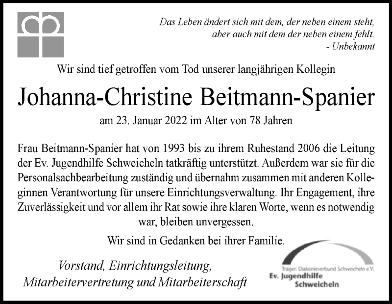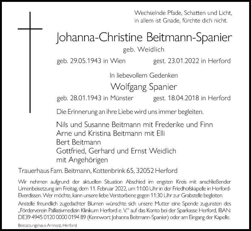 Hier finden Sie alle Traueranzeigen aus der Zeitung, die bisher für Johanna-Christine Beitmann-Spanier erschienen sind. Weitere Traueranzeigen, die in der Zeitung erscheinen, werden hier ebenfalls aufgelistet