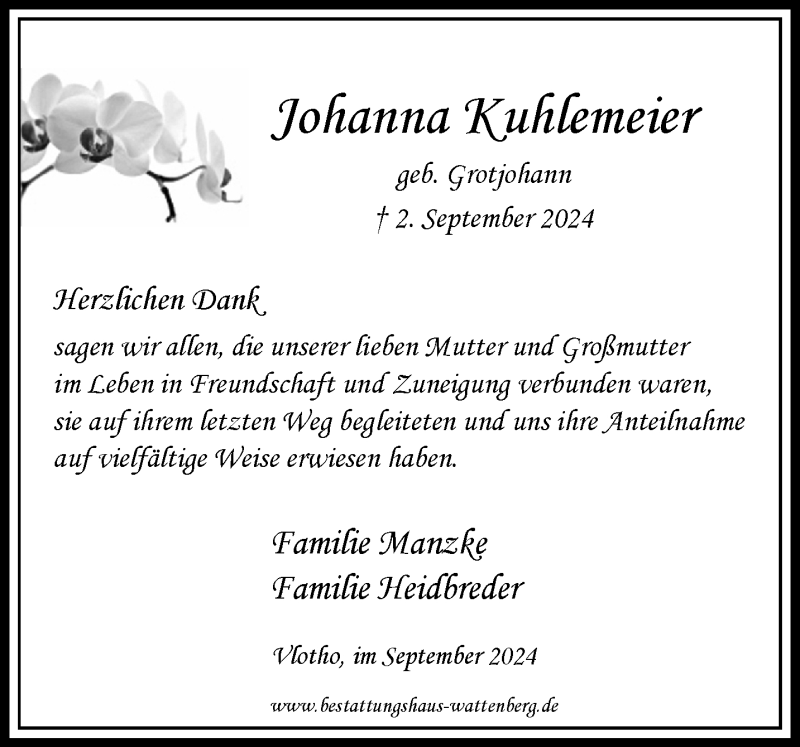 Hier finden Sie alle Traueranzeigen aus der Zeitung, die bisher für Johanna Kuhlemeier erschienen sind. Weitere Traueranzeigen, die in der Zeitung erscheinen, werden hier ebenfalls aufgelistet