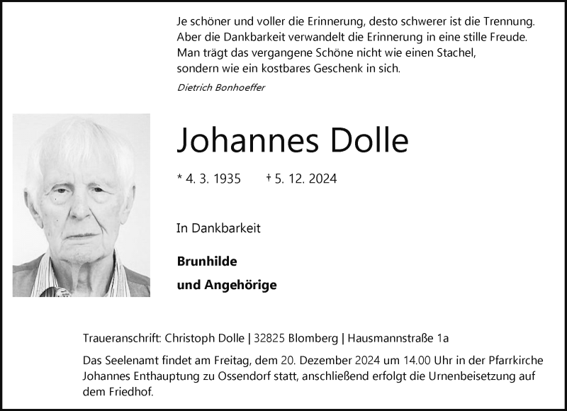 Hier finden Sie alle Traueranzeigen aus der Zeitung, die bisher für Johannes Dolle erschienen sind. Weitere Traueranzeigen, die in der Zeitung erscheinen, werden hier ebenfalls aufgelistet