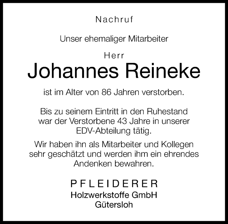 Hier finden Sie alle Traueranzeigen aus der Zeitung, die bisher für Johannes Reineke erschienen sind. Weitere Traueranzeigen, die in der Zeitung erscheinen, werden hier ebenfalls aufgelistet
