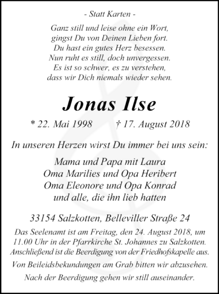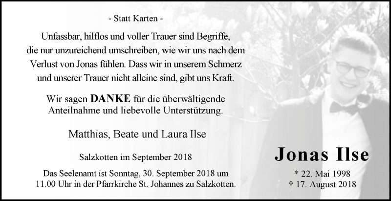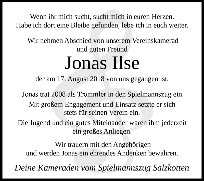 Hier finden Sie alle Traueranzeigen aus der Zeitung, die bisher für Jonas Ilse erschienen sind. Weitere Traueranzeigen, die in der Zeitung erscheinen, werden hier ebenfalls aufgelistet