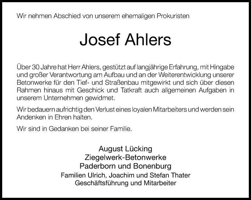 Hier finden Sie alle Traueranzeigen aus der Zeitung, die bisher für Josef Ahlers erschienen sind. Weitere Traueranzeigen, die in der Zeitung erscheinen, werden hier ebenfalls aufgelistet