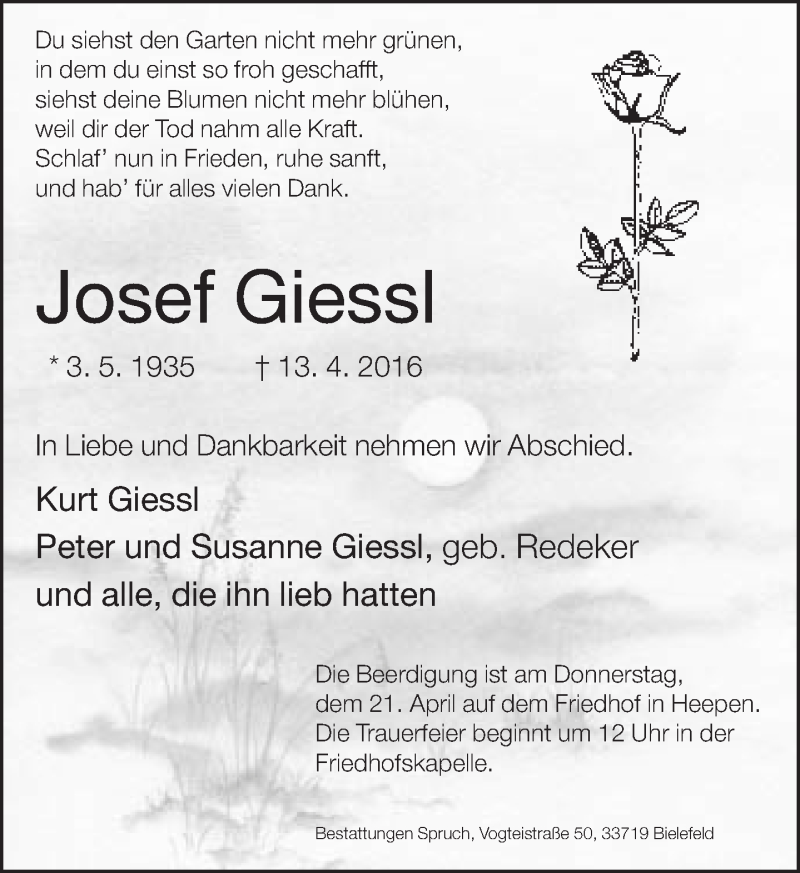 Hier finden Sie alle Traueranzeigen aus der Zeitung, die bisher für Josef Giessl erschienen sind. Weitere Traueranzeigen, die in der Zeitung erscheinen, werden hier ebenfalls aufgelistet