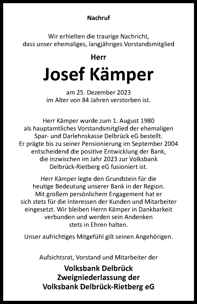Hier finden Sie alle Traueranzeigen aus der Zeitung, die bisher für Josef Kämper erschienen sind. Weitere Traueranzeigen, die in der Zeitung erscheinen, werden hier ebenfalls aufgelistet