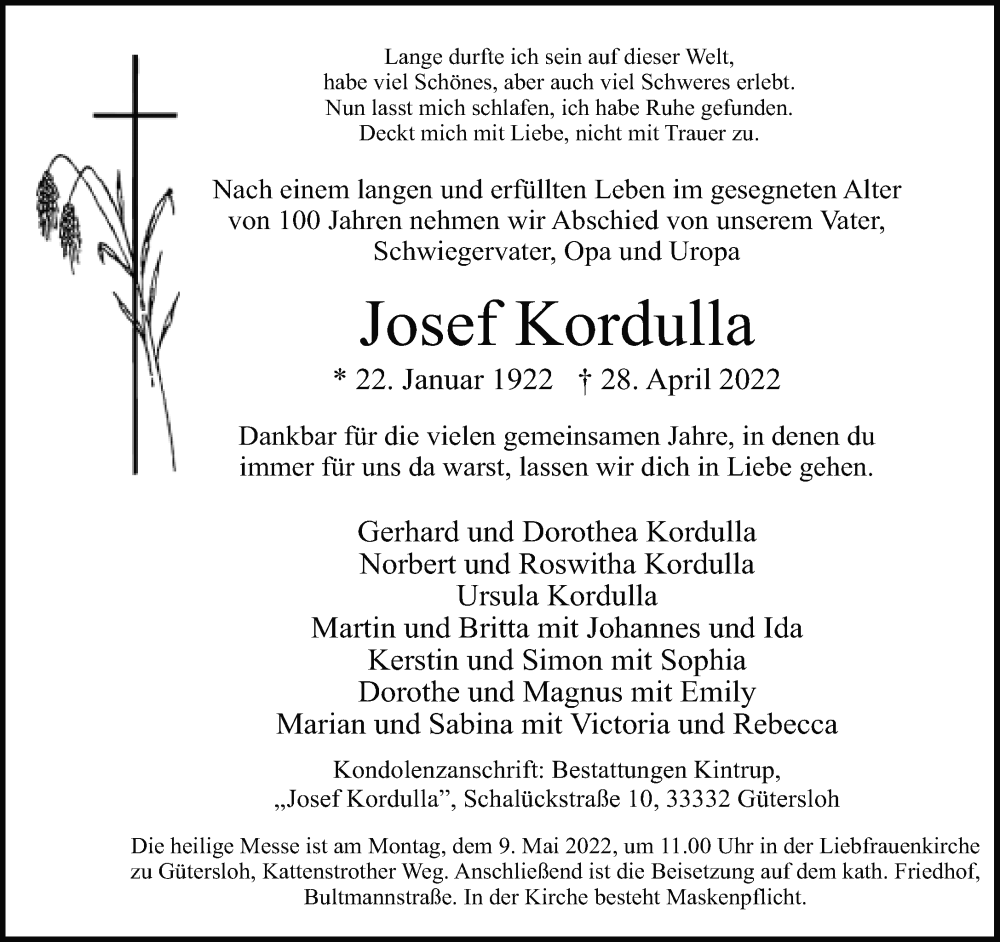 Hier finden Sie alle Traueranzeigen aus der Zeitung, die bisher für Josef Kordulla erschienen sind. Weitere Traueranzeigen, die in der Zeitung erscheinen, werden hier ebenfalls aufgelistet