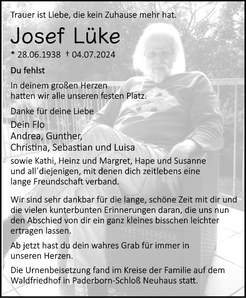 Hier finden Sie alle Traueranzeigen aus der Zeitung, die bisher für Josef Lüke erschienen sind. Weitere Traueranzeigen, die in der Zeitung erscheinen, werden hier ebenfalls aufgelistet