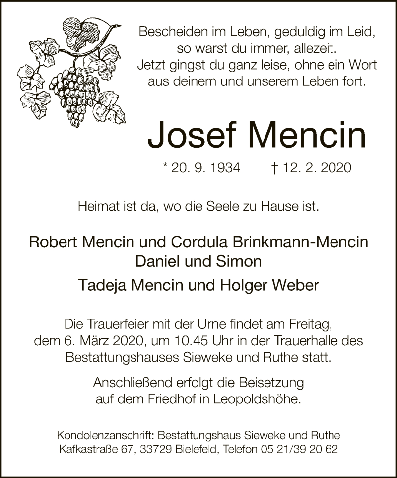 Hier finden Sie alle Traueranzeigen aus der Zeitung, die bisher für Josef Mencin erschienen sind. Weitere Traueranzeigen, die in der Zeitung erscheinen, werden hier ebenfalls aufgelistet