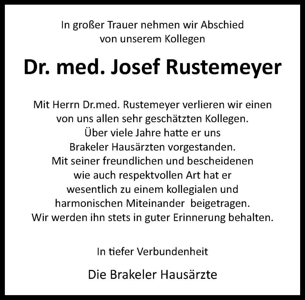 Hier finden Sie alle Traueranzeigen aus der Zeitung, die bisher für Josef Rustemeyer erschienen sind. Weitere Traueranzeigen, die in der Zeitung erscheinen, werden hier ebenfalls aufgelistet