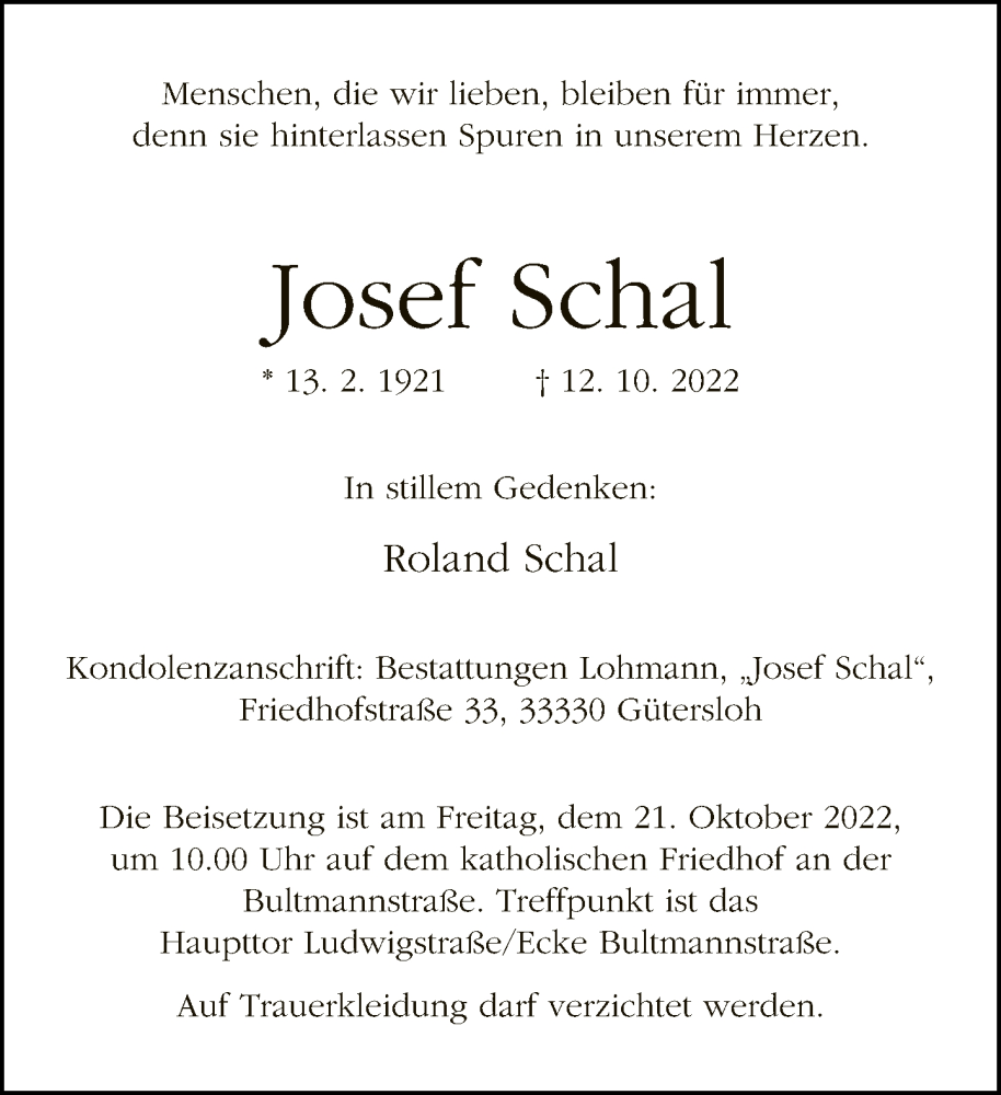 Hier finden Sie alle Traueranzeigen aus der Zeitung, die bisher für Josef Schal erschienen sind. Weitere Traueranzeigen, die in der Zeitung erscheinen, werden hier ebenfalls aufgelistet