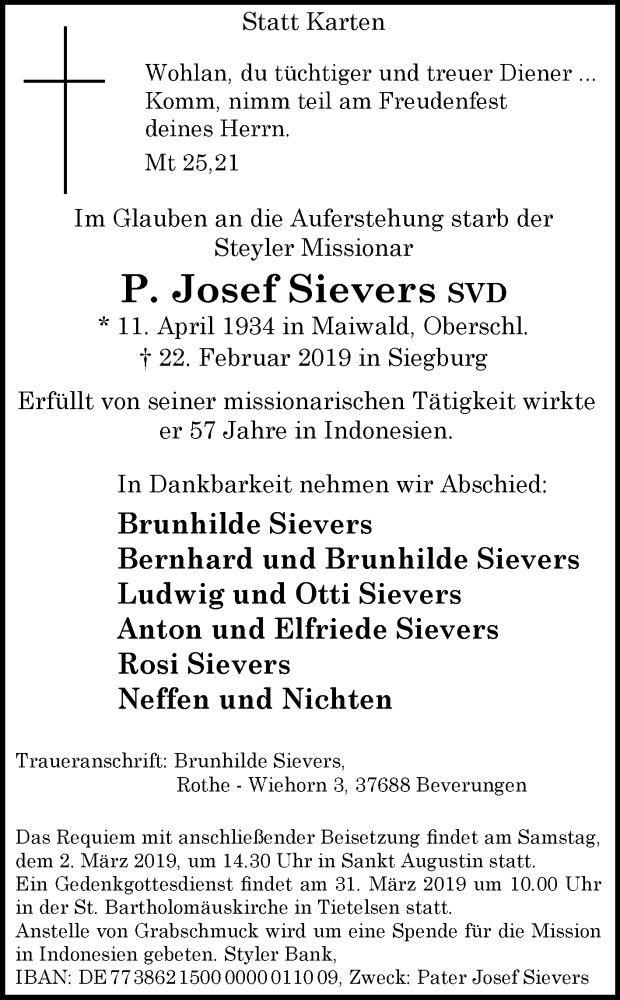 Hier finden Sie alle Traueranzeigen aus der Zeitung, die bisher für Josef Sievers erschienen sind. Weitere Traueranzeigen, die in der Zeitung erscheinen, werden hier ebenfalls aufgelistet
