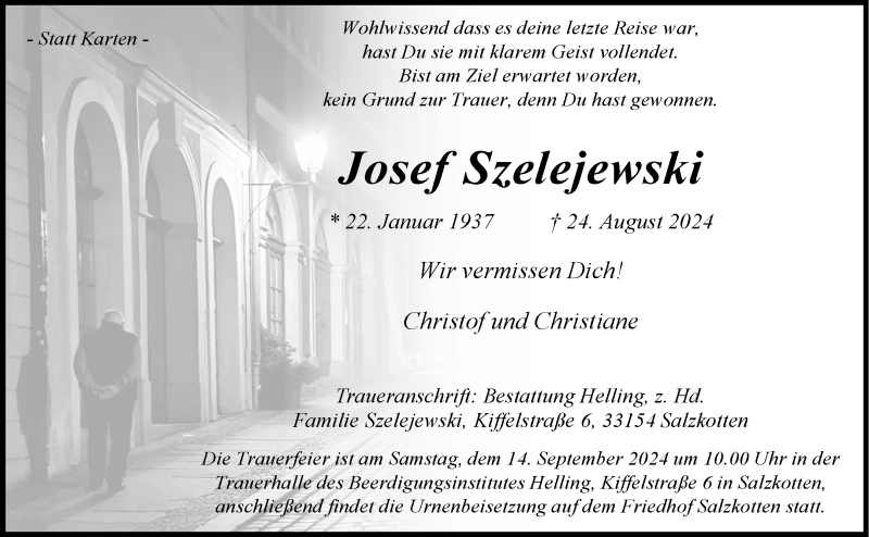 Hier finden Sie alle Traueranzeigen aus der Zeitung, die bisher für Josef Szelejewski erschienen sind. Weitere Traueranzeigen, die in der Zeitung erscheinen, werden hier ebenfalls aufgelistet