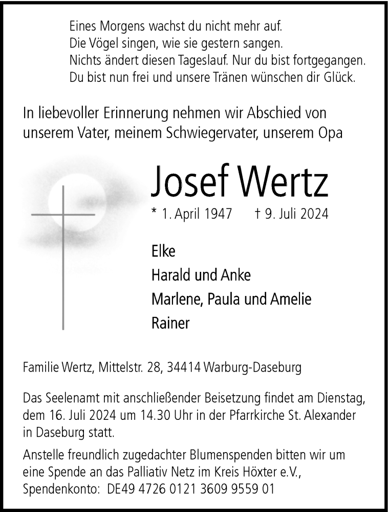 Hier finden Sie alle Traueranzeigen aus der Zeitung, die bisher für Josef Wertz erschienen sind. Weitere Traueranzeigen, die in der Zeitung erscheinen, werden hier ebenfalls aufgelistet