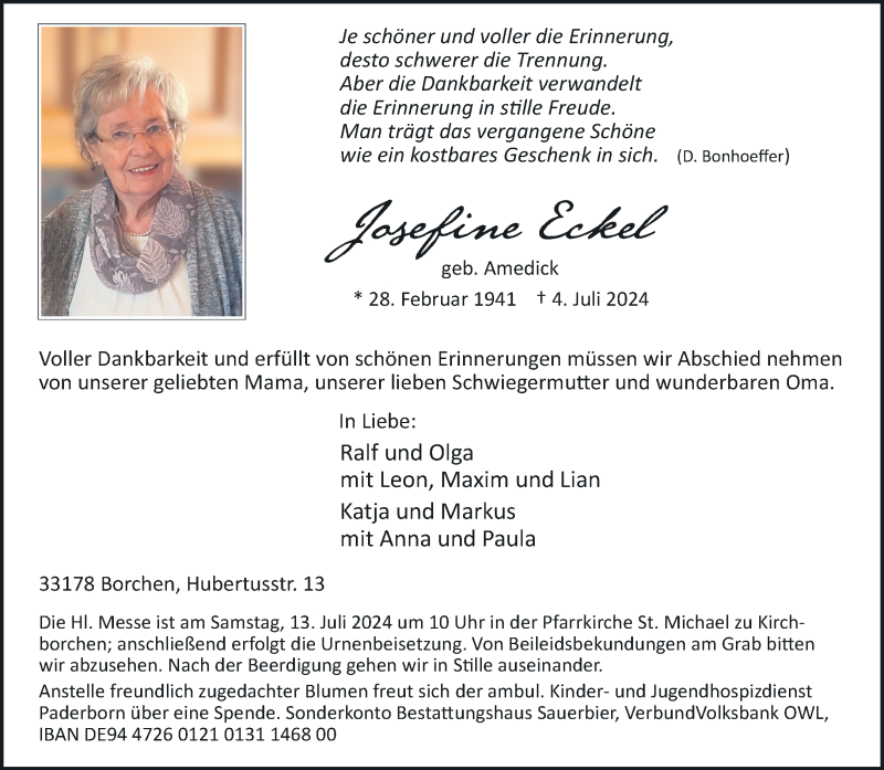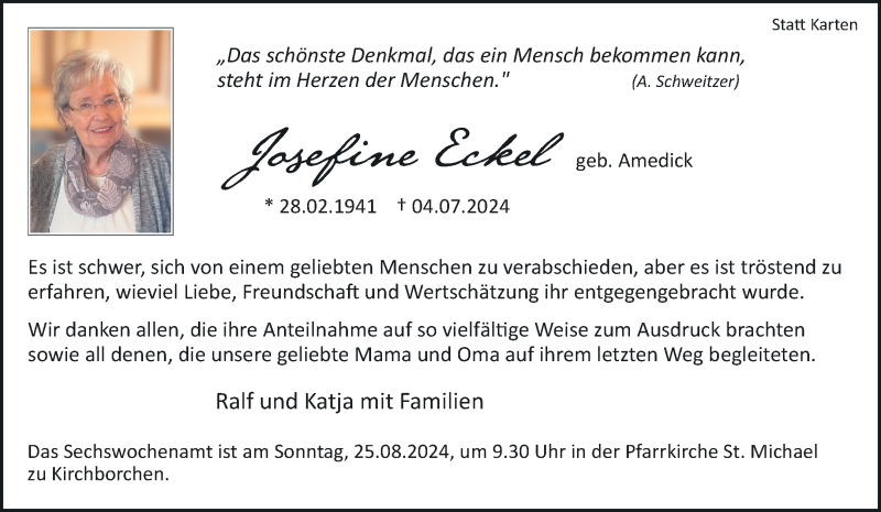 Hier finden Sie alle Traueranzeigen aus der Zeitung, die bisher für Josefine Eckel erschienen sind. Weitere Traueranzeigen, die in der Zeitung erscheinen, werden hier ebenfalls aufgelistet