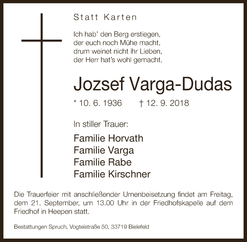 Hier finden Sie alle Traueranzeigen aus der Zeitung, die bisher für Jozsef Varga-Dudas erschienen sind. Weitere Traueranzeigen, die in der Zeitung erscheinen, werden hier ebenfalls aufgelistet