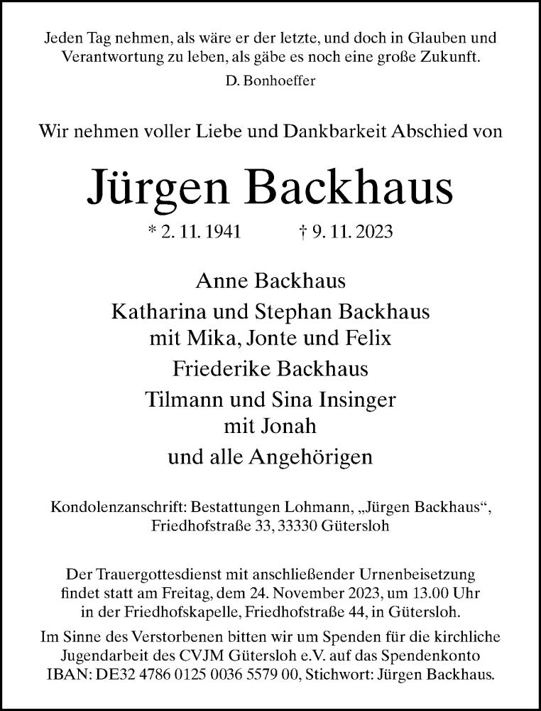 Hier finden Sie alle Traueranzeigen aus der Zeitung, die bisher für Jürgen Backhaus erschienen sind. Weitere Traueranzeigen, die in der Zeitung erscheinen, werden hier ebenfalls aufgelistet