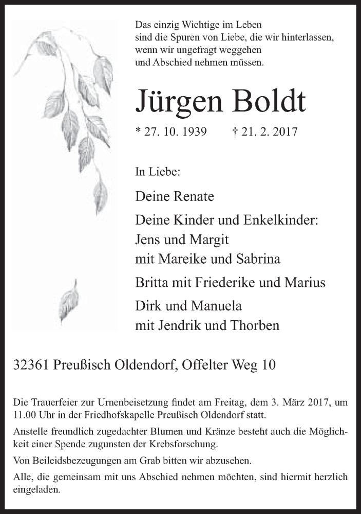 Hier finden Sie alle Traueranzeigen aus der Zeitung, die bisher für Jürgen Boldt erschienen sind. Weitere Traueranzeigen, die in der Zeitung erscheinen, werden hier ebenfalls aufgelistet