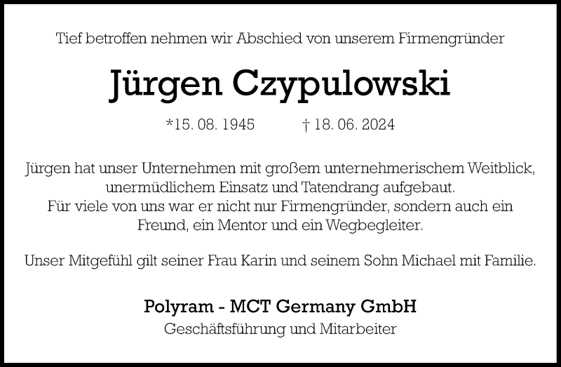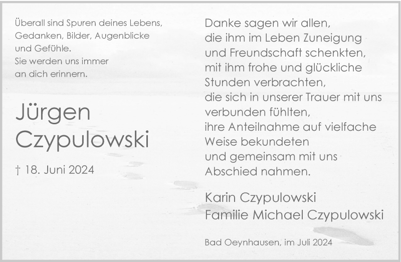 Hier finden Sie alle Traueranzeigen aus der Zeitung, die bisher für Jürgen Czypulowski erschienen sind. Weitere Traueranzeigen, die in der Zeitung erscheinen, werden hier ebenfalls aufgelistet