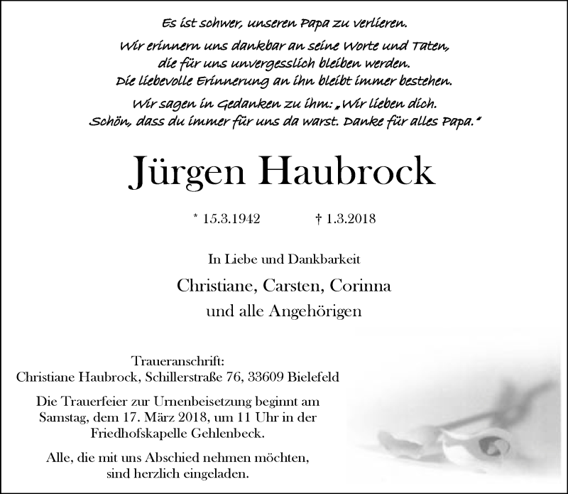 Hier finden Sie alle Traueranzeigen aus der Zeitung, die bisher für Jürgen Haubrock erschienen sind. Weitere Traueranzeigen, die in der Zeitung erscheinen, werden hier ebenfalls aufgelistet