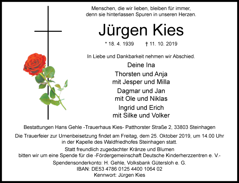Hier finden Sie alle Traueranzeigen aus der Zeitung, die bisher für Jürgen Kies erschienen sind. Weitere Traueranzeigen, die in der Zeitung erscheinen, werden hier ebenfalls aufgelistet
