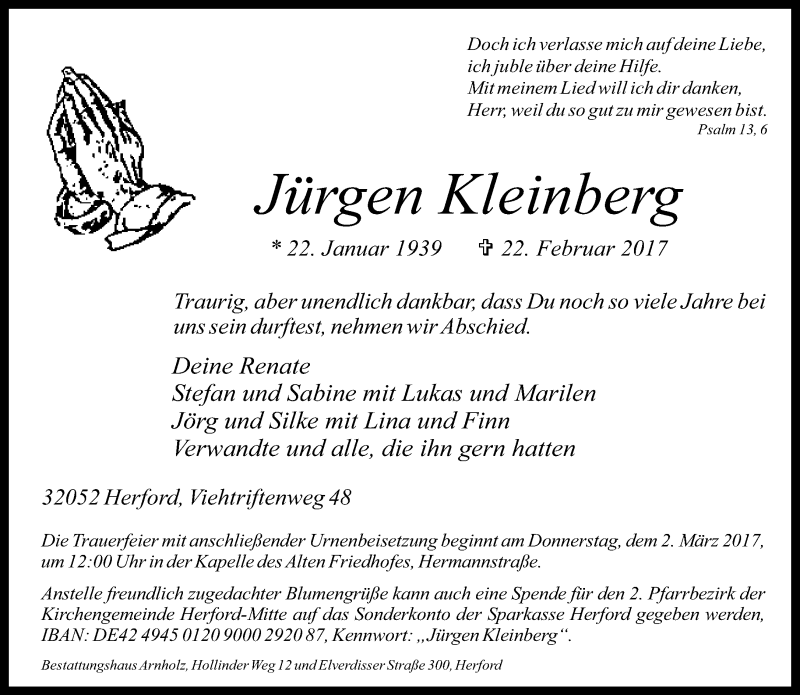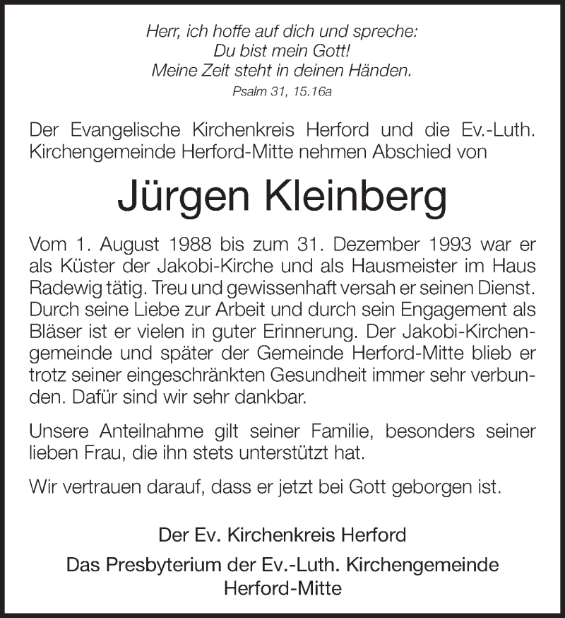 Hier finden Sie alle Traueranzeigen aus der Zeitung, die bisher für Jürgen Kleinberg erschienen sind. Weitere Traueranzeigen, die in der Zeitung erscheinen, werden hier ebenfalls aufgelistet