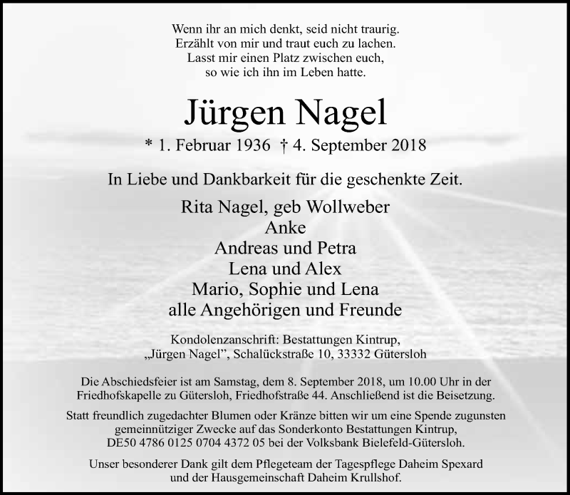 Hier finden Sie alle Traueranzeigen aus der Zeitung, die bisher für Jürgen Nagel erschienen sind. Weitere Traueranzeigen, die in der Zeitung erscheinen, werden hier ebenfalls aufgelistet