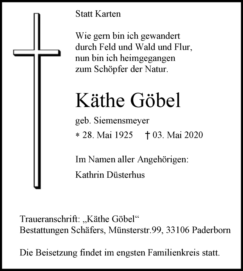 Hier finden Sie alle Traueranzeigen aus der Zeitung, die bisher für Käthe Göbel erschienen sind. Weitere Traueranzeigen, die in der Zeitung erscheinen, werden hier ebenfalls aufgelistet