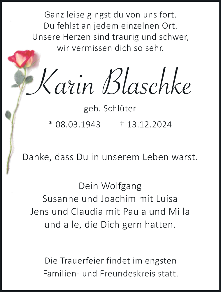 Hier finden Sie alle Traueranzeigen aus der Zeitung, die bisher für Karin Blaschke erschienen sind. Weitere Traueranzeigen, die in der Zeitung erscheinen, werden hier ebenfalls aufgelistet