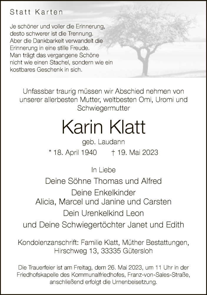 Hier finden Sie alle Traueranzeigen aus der Zeitung, die bisher für Karin Klatt erschienen sind. Weitere Traueranzeigen, die in der Zeitung erscheinen, werden hier ebenfalls aufgelistet
