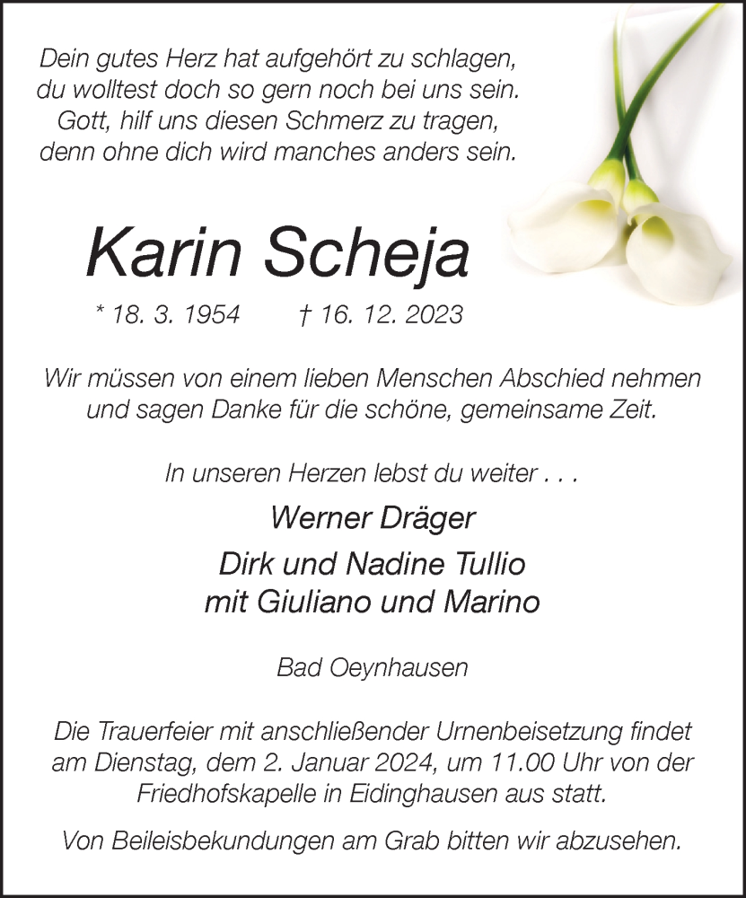 Hier finden Sie alle Traueranzeigen aus der Zeitung, die bisher für Karin Scheja erschienen sind. Weitere Traueranzeigen, die in der Zeitung erscheinen, werden hier ebenfalls aufgelistet