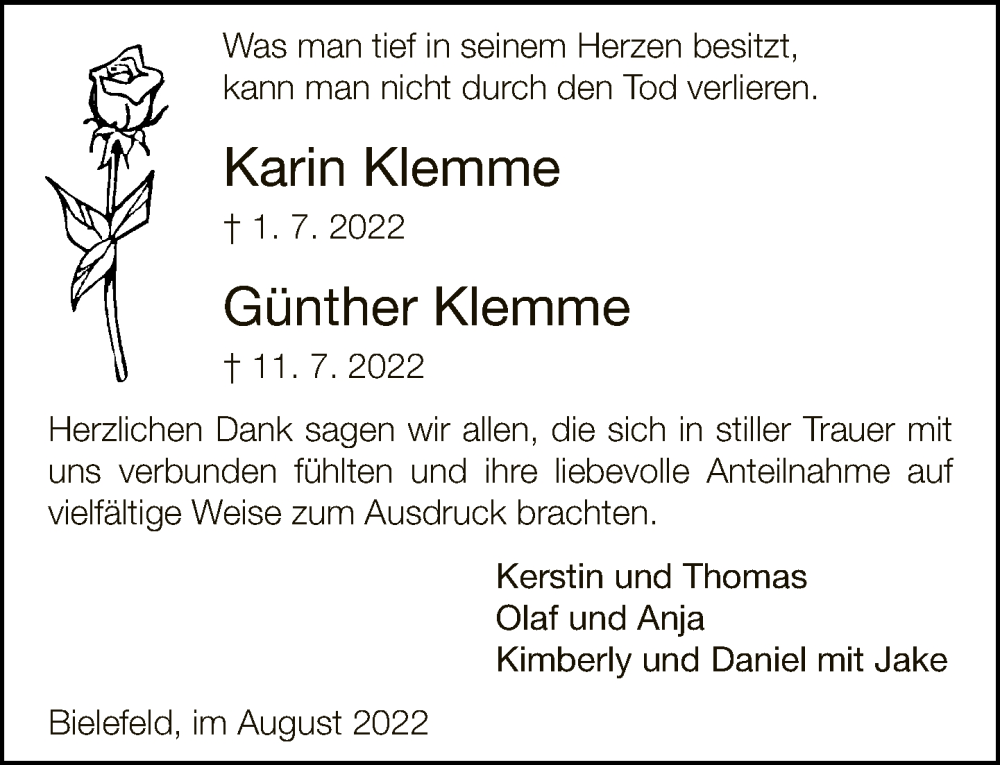 Hier finden Sie alle Traueranzeigen aus der Zeitung, die bisher für Karin und Günther Klemme erschienen sind. Weitere Traueranzeigen, die in der Zeitung erscheinen, werden hier ebenfalls aufgelistet