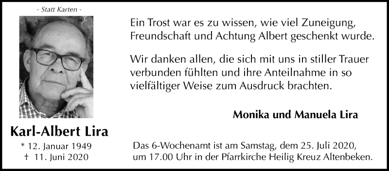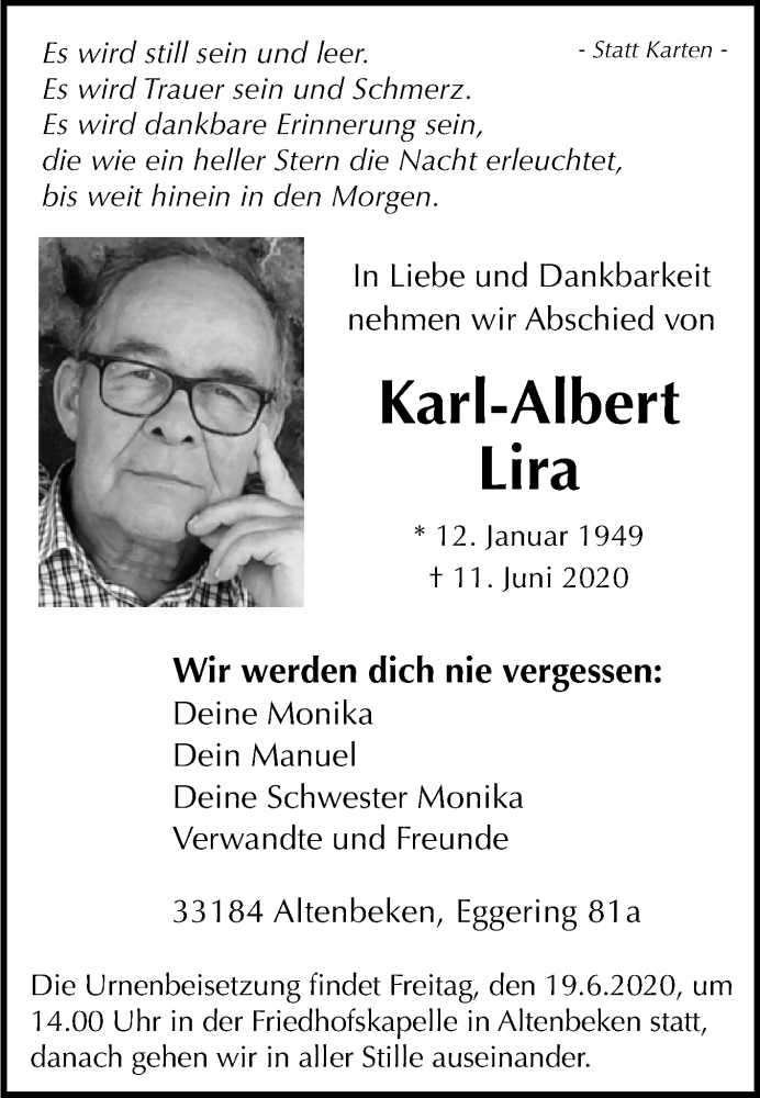 Hier finden Sie alle Traueranzeigen aus der Zeitung, die bisher für Karl-Albert Lira erschienen sind. Weitere Traueranzeigen, die in der Zeitung erscheinen, werden hier ebenfalls aufgelistet